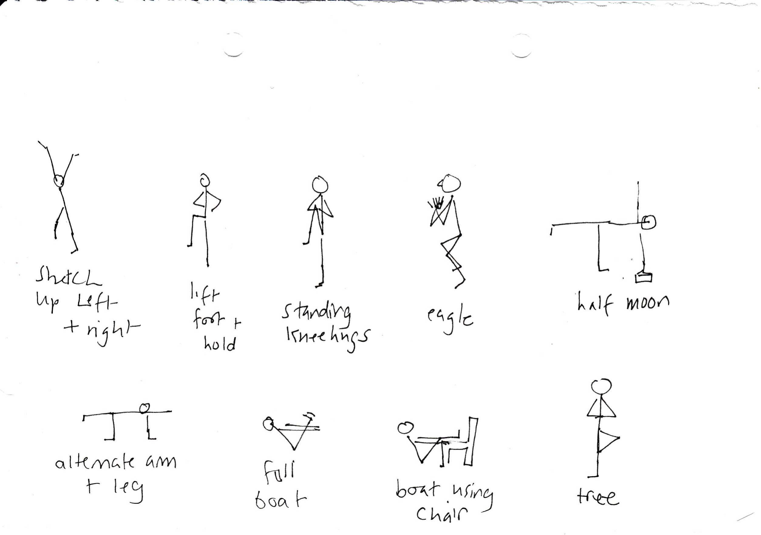 The sketches below are a reminder of some of the balances we’ve done in class. Want to read more on this important topic? Try this article in Yoga Journal.