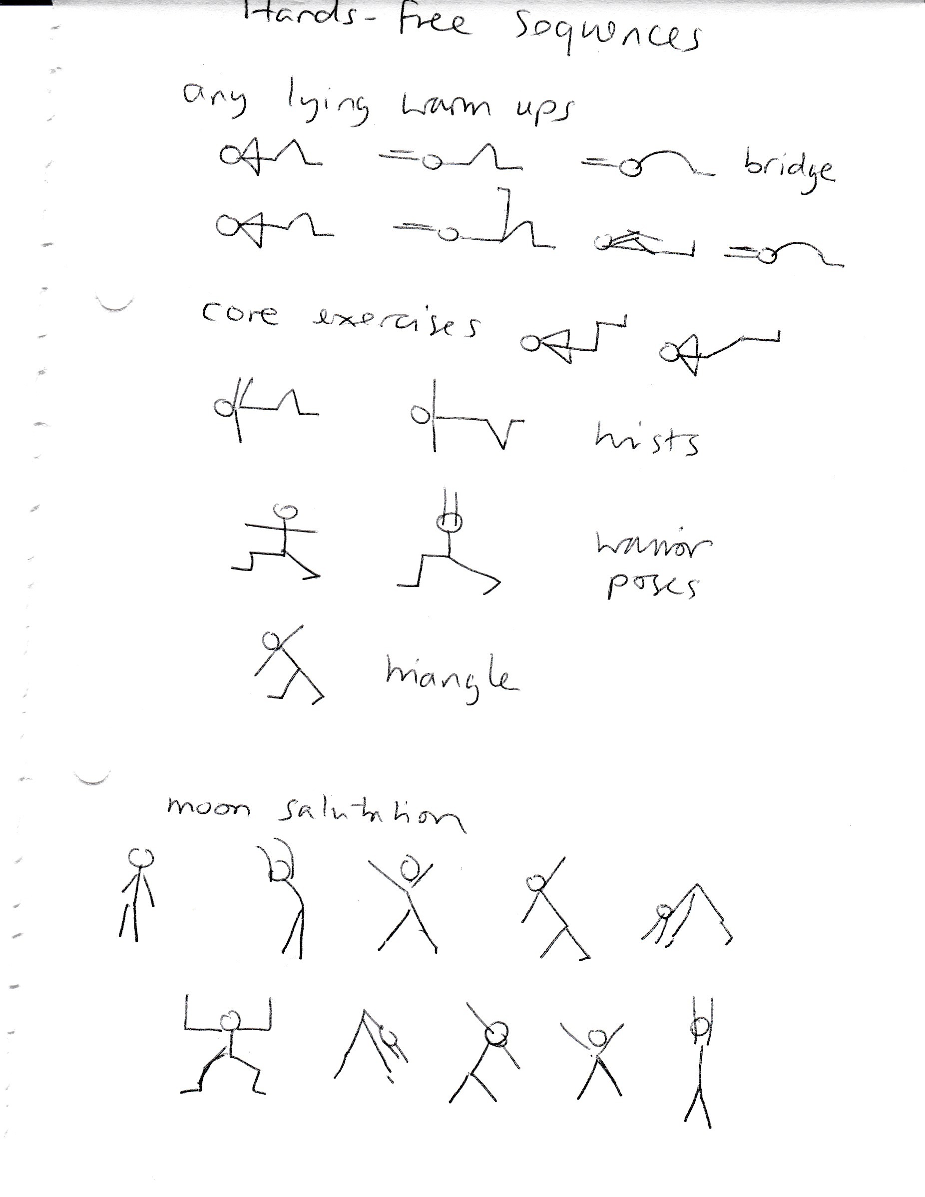 So rather than stopping your yoga altogether, there is plenty you can do without the need to put pressure through the wrists, and that’s what we did in class this week. The sketches below are a reminder (please note, not a how to guide):