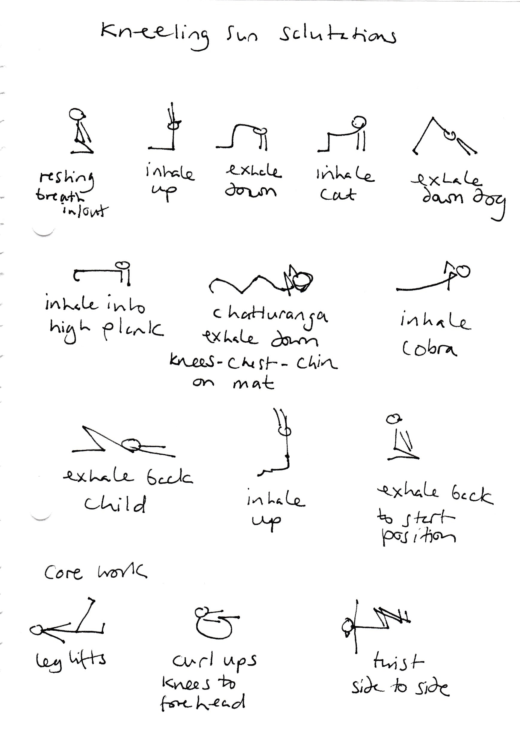 Below you’ll find a reminder of the kneeling salute to the sun sequence, and the Prayer to Pantanjali I passed around in class.