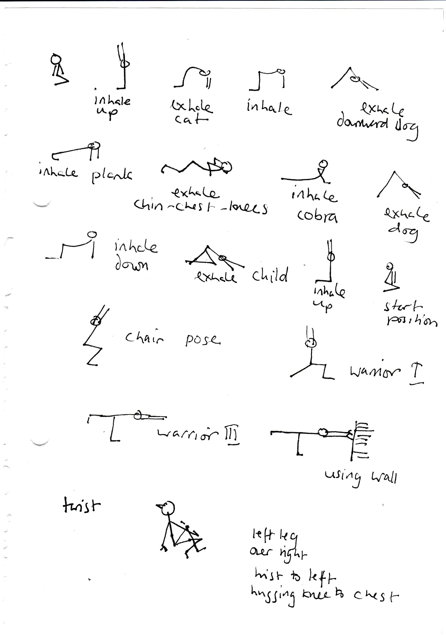 Below you will find some reminders of our yoga class this week. After a standing warm up sequence we came to the floor to practice ujaii breath, and then we tried using it with a sequence that included cat and downward dog.