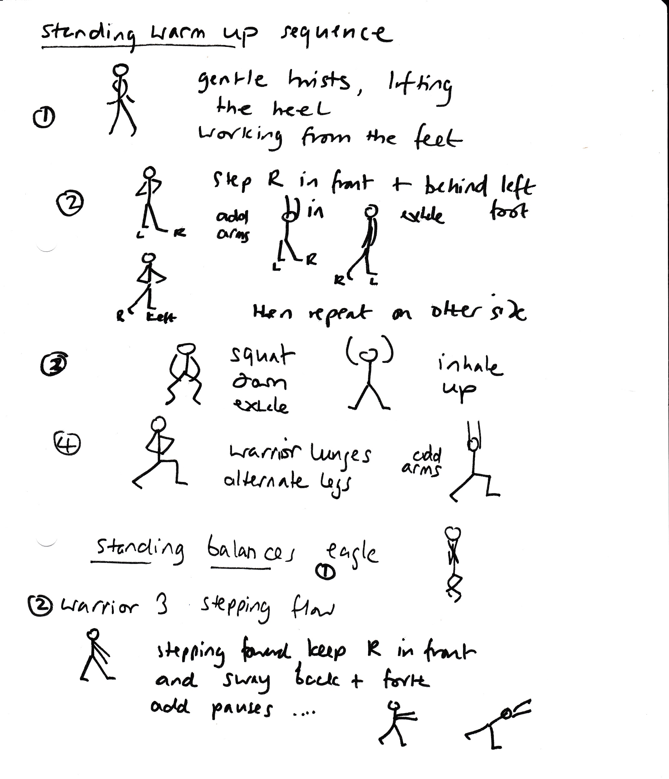 It’s worth doing this posture near the end of your sequence, but keep it in mind as you warm up so you thoroughly prepare for its convoluted shape. We began with the four part standing sequence below. Some moving cats, child and downward dog can follow next, and, perhaps something to tone up core muscles, which are so important in keeping the body stable in balances.
