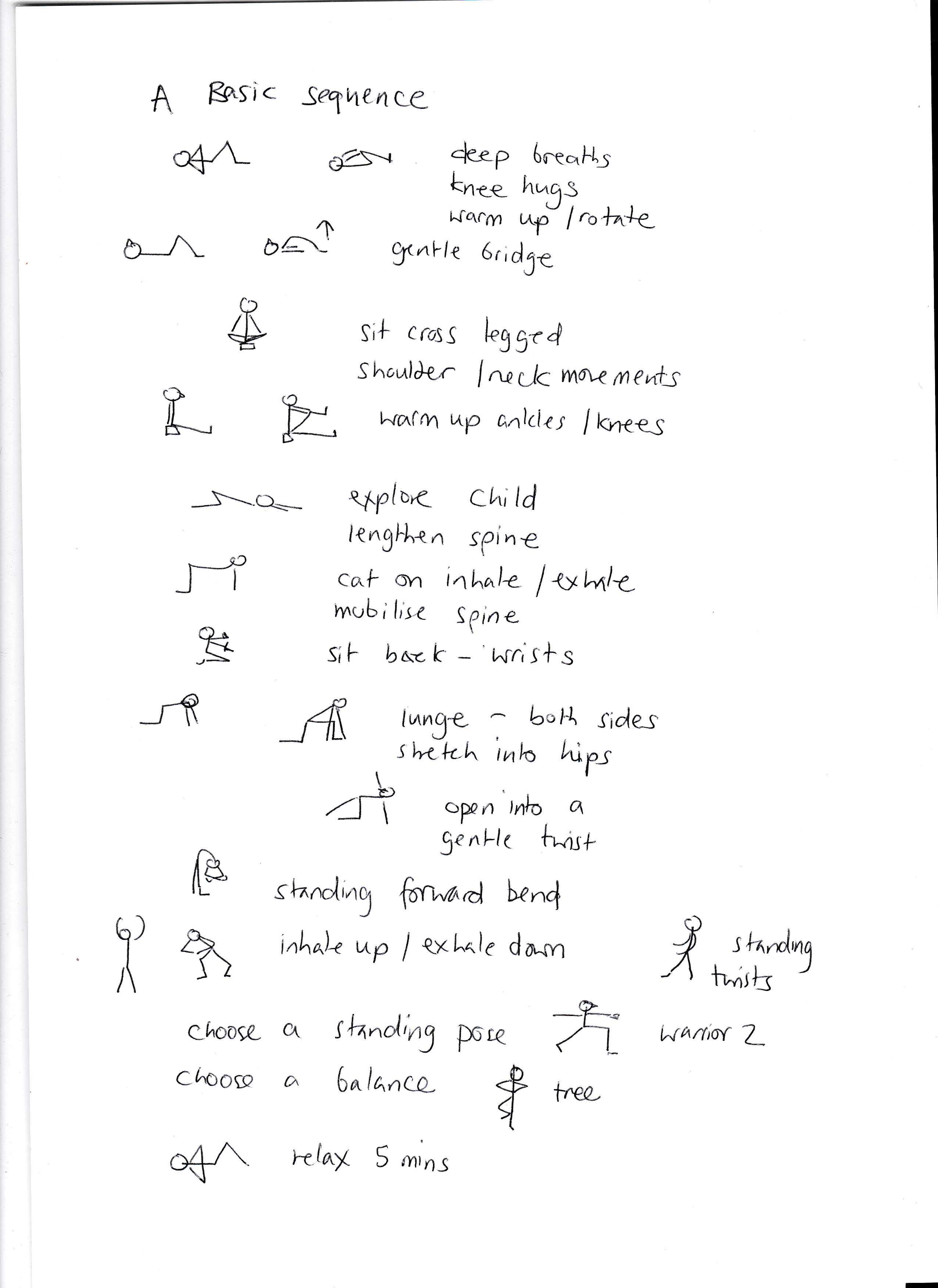 Here is an outline of a basic practice to get you started at home. You can add your own variations at each stage. A good way to start is lying down on your mat with the knees bent and feet hip width apart. Let yourself sink down into the floor and then take some deep yoga breaths, diving your inhale into three: belly, mid-chest and upper chest. Carefully hug in the knees, rocking over the back, and this about mobilising all your joints - feet, ankles knees etc. After bridge, child and cat, try some lunges, before coming to standing opting for any of the standing postures you know and a balance. You can always add some deeper stretches at the end before lying down for relaxation.