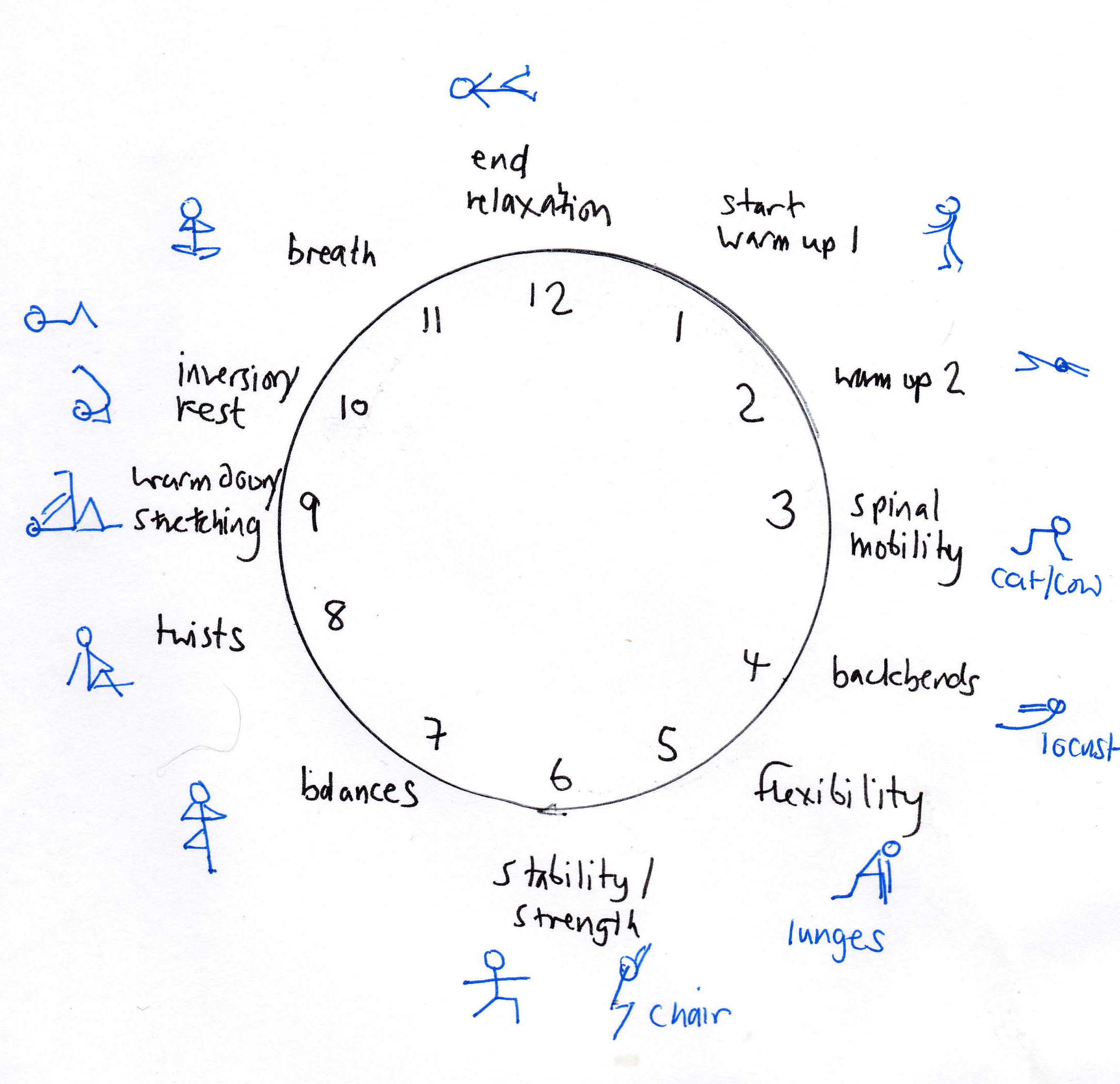 You can vary the numbers, but always add the first two and the last, and go in the order of the clock. The whole 12 will take about an hour. Once you get used to this sequence, you can vary the postures within each number, (for example, trying different backbends, standing postures or warm up sequences).