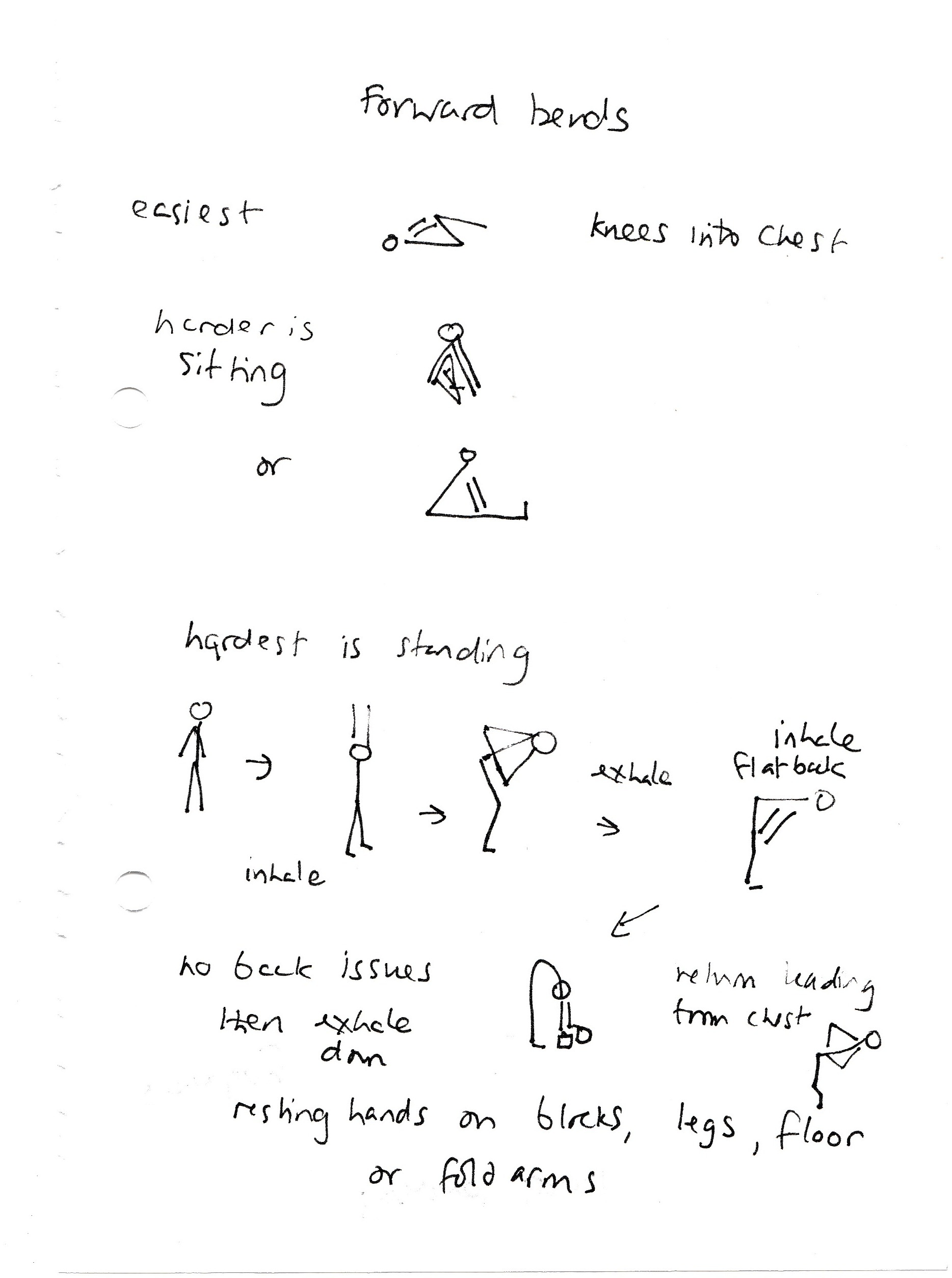They look simple, but I believe present just as much as a challenge as one of those pretzel like yoga postures. Make sure you are warm and the muscles prepared through some gentle movements before starting on a standing forward bend. For someone with no back issues, then the instruction to roll down releasing vertebrae by vertebrae should present no problem. However, I prefer to suggest that instead forward bends are done by first keeping the back straight, and hinging from the hip, rather than the waist. Come down as far as you can with a straight back, keeping the legs active with a slight bend in the knee.